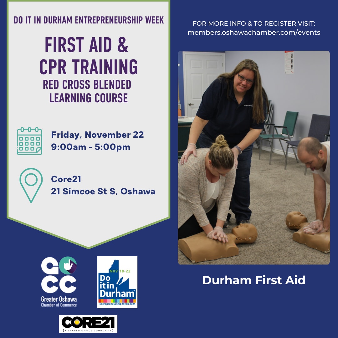 The Greater Oshawa Chamber of Commerce, in partnership with Durham First Aid, is hosting a Red Cross Blended Learning Course on Friday, November 22nd, to ensure your workplace is certified.