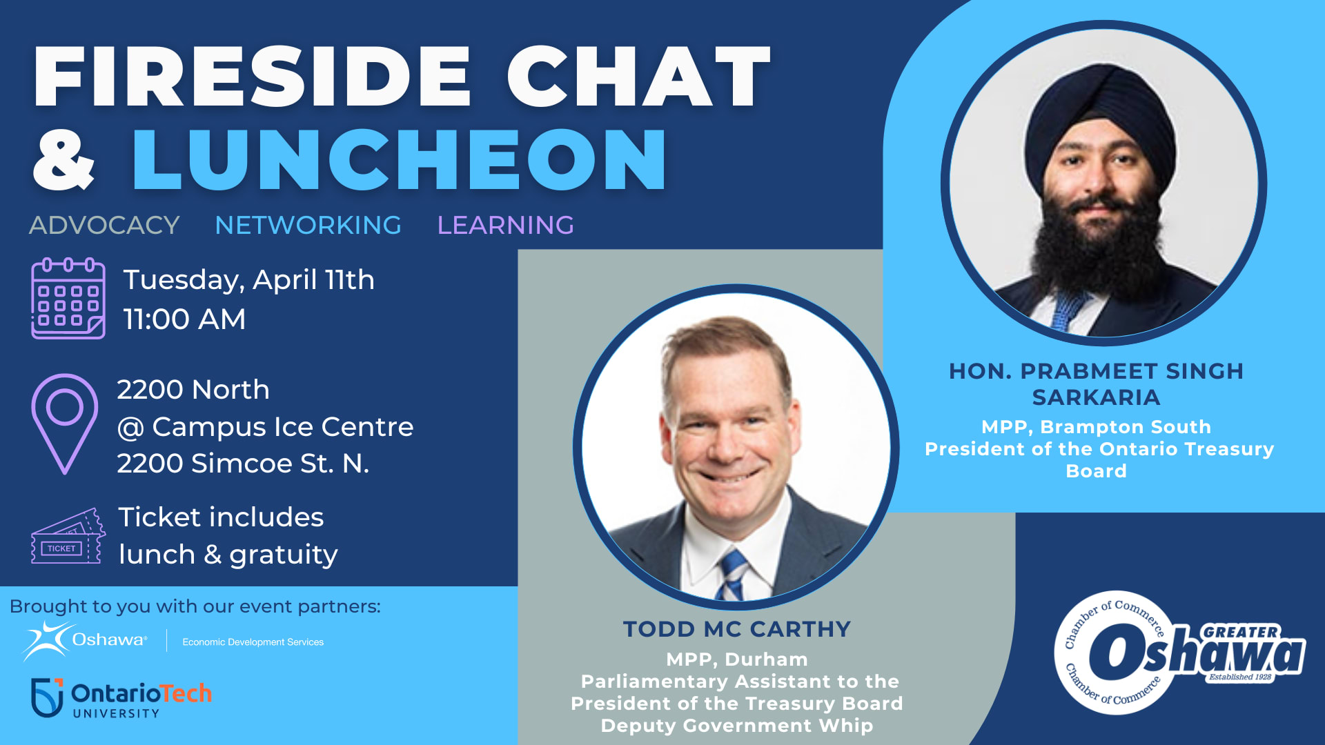 Join us for a fireside chat and luncheon featuring two esteemed Members of Provincial Parliament (MPPs) in Ontario, the Hon Prabmeet Singh Sarkaria and Todd McCarthy. The event will take place at 2200 North, located on the Campus Ice Centre in North Oshawa.