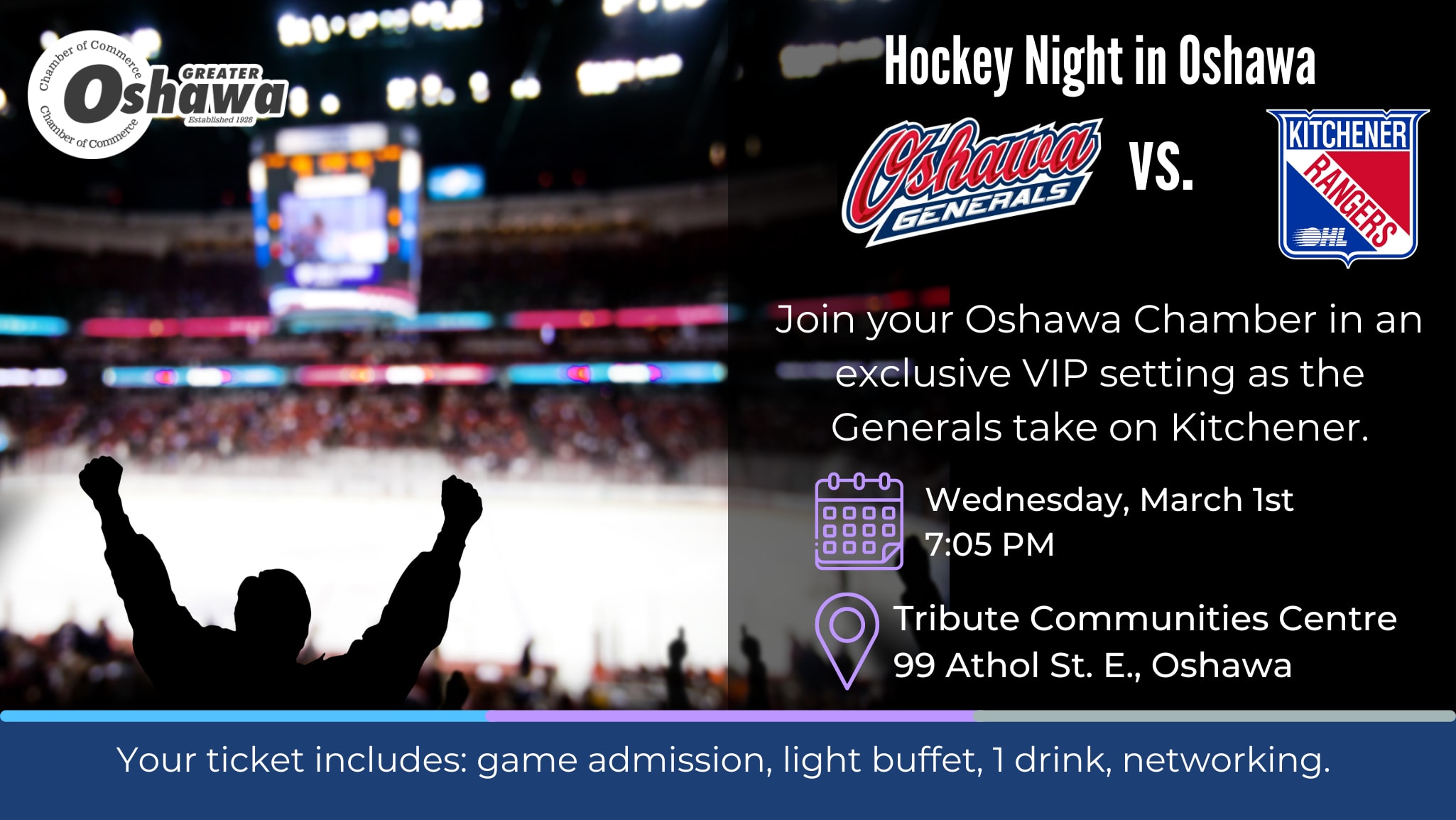 Join us for an evening at the good ole' hockey game! On Wednesday, March 1st, our Oshawa Generals take on the Kitchener Rangers in one of their last Regular Season home games at The Tribute Communities Centre. Your ticket includes admission to the game, one drink, game-time snacks, networking and socializing, exciting Zamboni action, and more!