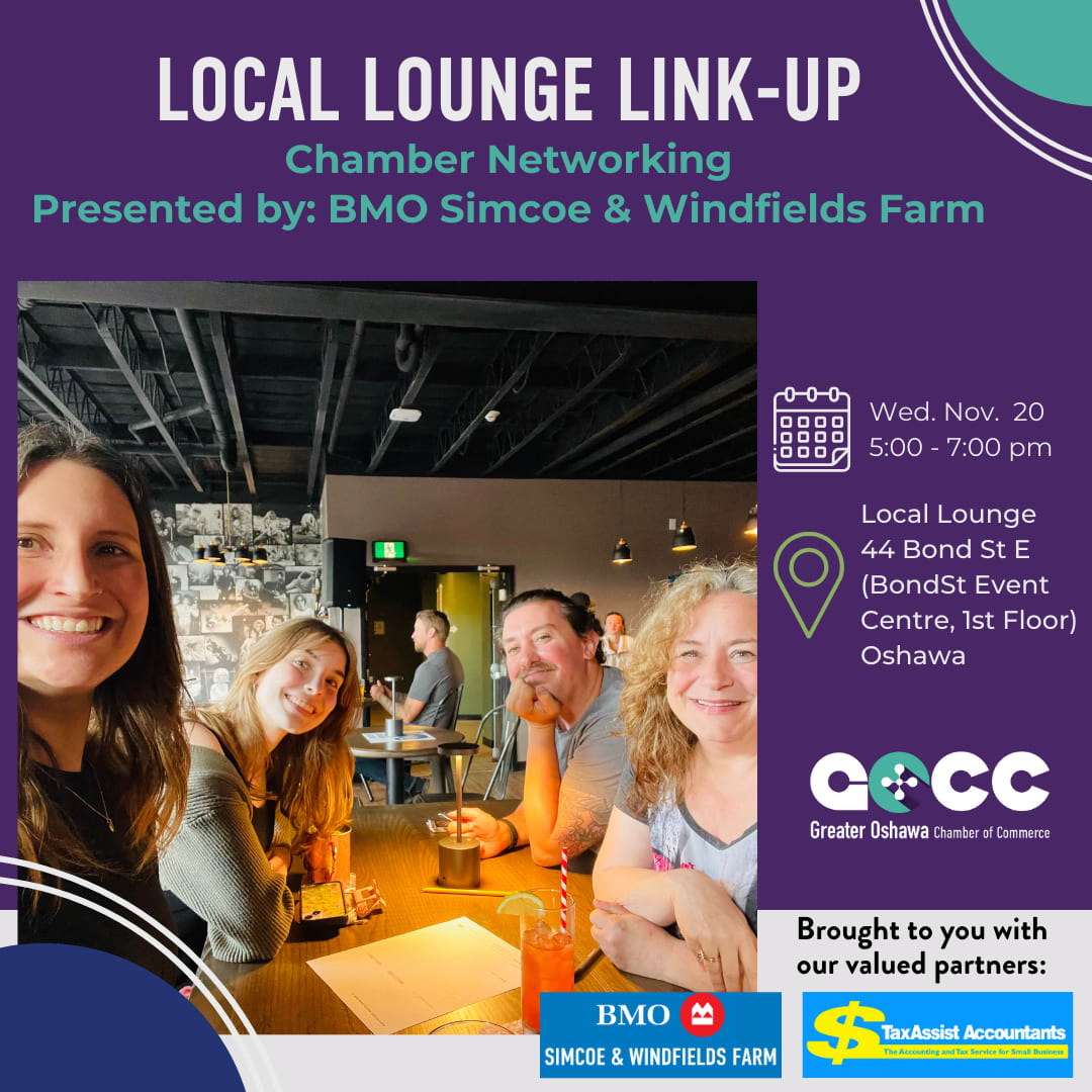 Ready to expand your professional network and connect with local business leaders? Join us at the Local Lounge Link-Up on Wednesday, November 20th, from 5-7pm at the Local Lounge in the Bond Street Event Centre in downtown Oshawa!