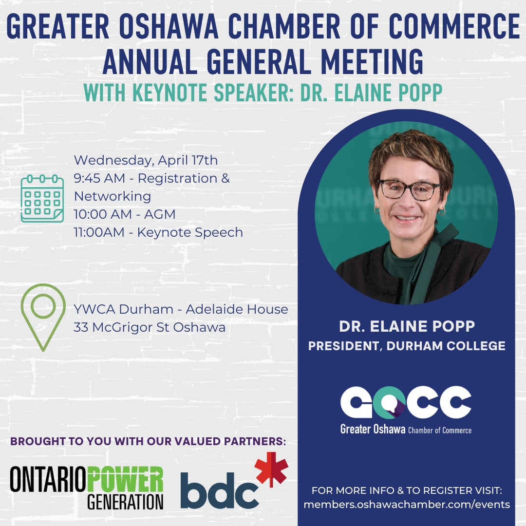 Please note: The AGM official meeting proceedings are offered exclusively and at no charge for members of the Greater Oshawa Chamber of Commerce, but the keynote from Dr. Popp is a paid ticketed event, open to all.