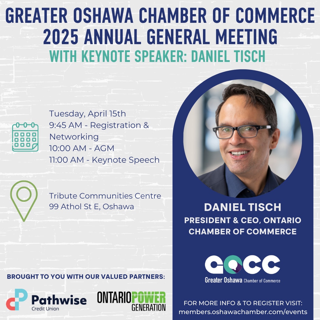 **Please note: The AGM official meeting proceedings are offered exclusively and at no charge for members of the Greater Oshawa Chamber of Commerce, but the keynote from Daniel Tisch is a paid ticketed event, open to all.