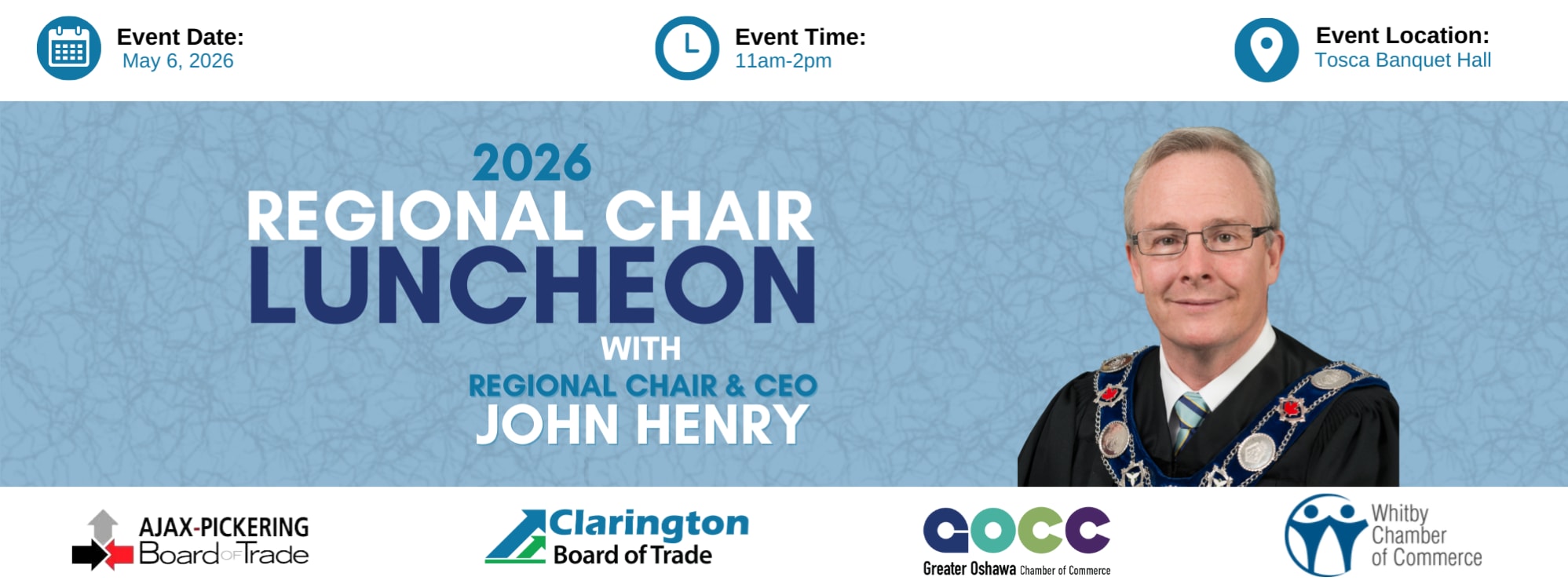 Join us for a Joint Chamber event co-presented by the Ajax-Pickering Board of Trade, Clarington Board of Trade, Greater Oshawa Chamber of Commerce, and Whitby Chamber of Commerce, featuring exclusive insights from John Henry, Regional Chair and CEO of Durham Region, as he shares updates across the region and initiatives impacting our local business community.