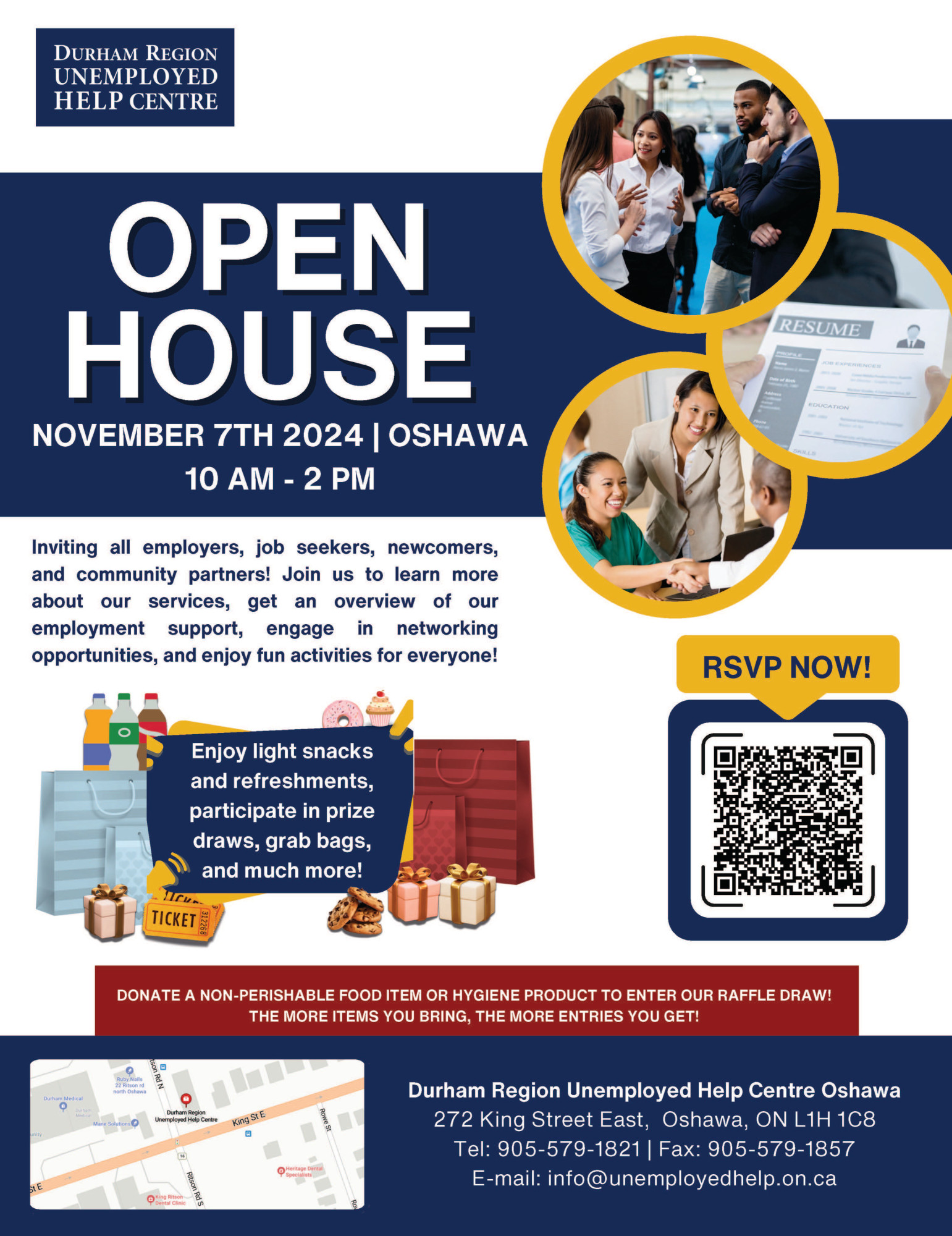 Open House Date: November 7th Time: 10:00am : 2:00pm Oshawa: 272 King St E, Oshawa ON, L1H 1C8 RSVP Link for Oshawa: https://www.eventbrite.ca/e/open-house-for-employers-job-seekers-newcomers-and-the-community-oshawa-tickets-1050769759637
